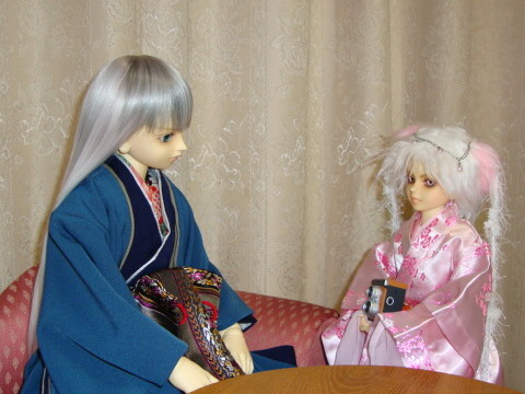 魅影 「何を持っているんだ、氷雨」 氷雨 「えと、カメラ」 魅影 「紫水が使っている物か」 氷雨 「教えてもらったですよ。 魅影 「どれ」 カシャ 魅影 「(、、、、油断した)氷雨、見せてくれるか」 氷雨 「あい」 魅影 「、、、ここを押せばいいと思うぞ」 氷雨 「ここ?魅影さま」 魅影 「ん?」 カシャ 魅影 「(いや、そうじゃくてだな)氷雨、他の人を撮る時は、ちゃんと声をかけて 相手がいいといってからにしないさい。 とられる方にも心の準備がいるからな」 氷雨 「ちゃんとお返事もらってから、、、わかったです。 じゃあ、魅影さまもう一回。こっち向いてください」 |