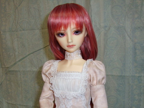 くまのぬいぐるみフレデリックを隣に置き、無邪気な笑顔を向ける。
