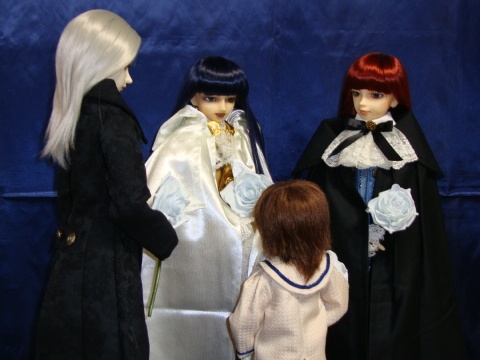 生誕祭当日。 街は蒼と白の光で美しく飾られていた。 「この光景も変わりませんね」 「誰も始まりの云われを知らない。 「どうして蒼と白なんだろうね。ファルアさん知ってる?」 「いえ、私も知りません」 絡瑛は、その色に込められた想いに心を寄せる。 「あ、お花屋さんがきた」 「買ってきましょう」 「うん」 ファルアと愁馬は花をのせたワゴンに向かった。 「兄さん」 「ん?」 「傍らで、同じ時間を共有したい女性はいないんですか」 「な、急に何を」 だが、絡瑛の視線が愁馬に向いていることに気が付いた。 「何をどうすれば愁馬のためなのか、まだ霧の中さ。 愁馬を養子にして彩華月の一員に迎えるのも、選択肢の一つ。 だが、そのためには愁馬が母親と呼べる女性が必要だ。 そしてその女性は 望む望まないに関わらず、名門の肩書は消えない。 「見合い写真は嫌ってほど送られてくるが何をどう判断したらいいのかさっぱりだ」 「難しいけれど、きっといい道が見つかりますよ」 「そう思うか?」 「この光に包まれていると、そう思えてきませんか?」 瑞樹は街を見渡す。 揺れる灯りは、愛し子を抱いているようでもあった。 ならば、この街に生きる自分も 「そうだな。きっと」 「ええ」 「瑞樹さん」 5人分の花を抱えた愁馬が戻ってきた。 「はい。瑞樹さんのお花」 「ありがとう」 「絡瑛さんも」 「私の分まですみません」 「それから、ファルアさんと僕とおじい様の、あ、そっか」 手渡しながら、愁馬は小さく呟いた。 「どうした」 「今年は絡瑛さんが一緒だから一輪なんだね」 「一輪、、、、そうだな」 「兄さん?」 「毎年お前の分も持ってたから、手には2輪あった。 だがそれも、今回限りなのだろうか。 次の生誕祭には、再び2輪の花を手にするのか。 「絡瑛、戻ってくれとは言わないが 絡瑛は愁馬のいい話し相手にもなっていた。 瑞樹の前で飲み込んでいる言葉を、愁馬は絡瑛に向ける。 「絡瑛さん、だめ?」 きゅっとマントの端をつかみ見上げてくる瞳に 「また、近いうちに会いに来ますね」 「ほんと?」 「約束します」 「絶対だよ」 「よかったですね。愁馬様」 「うん」 教会の鐘が鳴った。 献花台の準備が整った合図だ。 「行こう」 先に駈け出したのは愁馬。 ファルアが続き、瑞樹と絡瑛は少し遅れて歩き出した。 「愁馬も懐いてくれたみたいだな」 「気遣いのできる優しい子ですね」 「本当にいい子だよ」 「瑞樹さん、早く」 「今行く」 手を振る愁馬に答えた時、視界の隅にとある人影が映った。 「ん?」 「どうしました」 「あれは、紫」 その名を言いかけて向きを変えるが、知った姿はない。「気のせいか」 「、、、、、行きましょう」 「ああ」 |