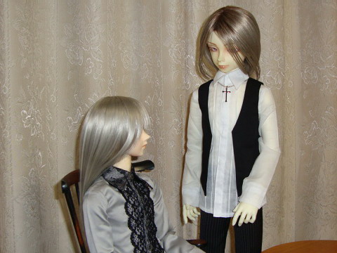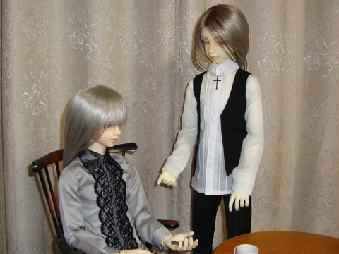「兄貴」 「、、、、お帰り。ずいぶん早いな。 「兄貴が助けた子供、名前スピネルだよな」 ヴェリルの手が止まる。 「どうしてお前が名前を?私が言ったか?」 「宿の前で母親とその子に会った。 「何だって」 「その前にもう一度会って、宝物を渡したい。 「、、、、、」 預かった天使を、そっとヴェリルに差し出した。掌に収まる少年の想いを、ヴェリルはただ見つめる。 「言いわけでも何でもない。 「ソプレーゼ」 「汽車の時間は聞いてる。 「だが、父親も一緒なんだろう。だったら」 「だったらどうした」 今度ばかりは譲れない。 「顔を見せるだけでもいいだろう。 「、、、、、」 「ほんとに、このままでいいのか?兄貴」 宿で見たスピネルは寂しそうな顔だった。 笑った顔が見られるとしたら 「行ってくる。時間教えてくれ」 ソプレーゼから必要な事を聞き、家を出た。 残ったソプレーゼは時計を見る。 間に合うかどうかは、きっかり五分だろう。 「間に合ってくれ、頼む」 祈るように呟いた。 |