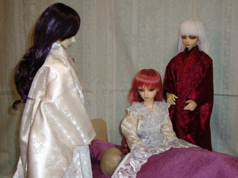 「んっ、、、、」 「リシュナ?」 「リシュナ殿」 「しっかりいたせ。リシュナ」 「あ、、、アズライル様、、、私」 リシュナの瞳が開いた。 「リシュナ、わかるか」 「今のは夢、、、、いえ、違うわ。サイファ」 小さな体が隣で横たわっていた。 「しっかりして」 「リシュナ殿、サイファのことがわかりますか」 「道を示してくれました。夢だと気づかせてくれた。 「リシュナ」 「追いかけると約束してくれたんです。 「まさか、、、、サイファ」 「戻っておいで。待っていると言ったはずだ」 「お願い。戻ってきて」 届くことを願い、信じて名前を呼んだ。 |